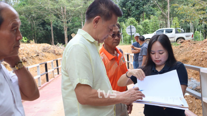 Datuk Ding Kuong Hiing listens to an explanation while inspecting the completed orchard road bridge construction project in Batu Lapan, Jalan KJD Bintangor. Photo TVS